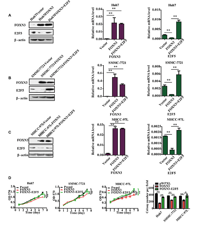 Figure 6: Reintroduction of E2F5 impairs the FOXN3-induced suppression of HCC cell proliferation. (A), (B) and (C) Western blot and qPCR analyses of FOXN3 or E2F5 expression in E2F5-trasfected HCC cells or controls. (D) Cell growth at different time points (every one day interval) was analyzed using an MTT assay and colony formation assay. *P < 0.05, **P < 0.01.