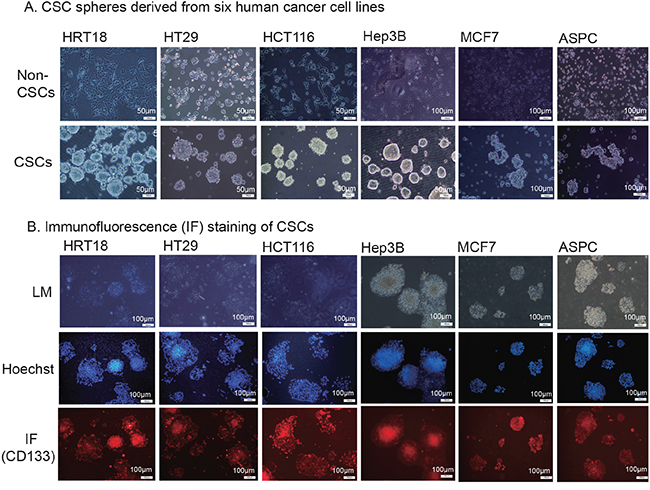 Figure 1: Isolation of cancer stem cells (CSCs). A. CSC spheres derived from six human cancer cell lines. Tumor cells were sorted by FACS to separate the CD133− and CD133+ subpopulations. The CD133− cells were cultured in RPMI 1640 or DMDM and were classified as the non-cancer stem cells (non-CSCs). The CD133+ cells were cultured in nonadhesive plates in cancer sphere medium (DMEM-F12 supplemented with 20 ng/ml bFGF, 20 ng/mL EGF, and 20 μl/ml B27). B. Immunofluorescence (IF) staining of CSCs. The sphere cells were treated with 4% paraformaldehyde, incubated with anti-CD133 antibody, and followed by the secondary antibody conjugated to fluorescent phycobiliproteins. Hoechst 33258 was used for nuclear counterstaining.