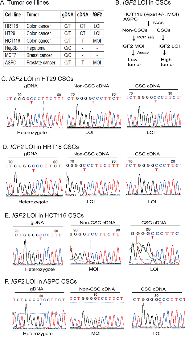 Figure 2: Differential loss of IGF2 imprinting in CSCs. A. Imprinting status in cancer cell lines. Using ApaI restriction enzyme typing and DNA sequencing of genomic DNA (gDNA), six human cancer cell lines were divided into informative (heterozygous C/T) and non-informative (homozygous C/C). By examining the expression of cDNA, HRT18 and HT29 were shown to demonstrate loss of IGF2 imprinting (LOI). In contrast, HCT116 and ASPC were grouped as maintenance of IGF2 imprinting (MOI). Hep3B and MCF7 were homozygous for the SNP and could not be used for imprinting analysis. gDNA: genomic DNA; cDNA: complementary DNA from reverse transcription. B. Differential IGF2 imprinting between CSCs and non-CSCs. Two MOI tumor cells (HCT116 and ASPC) were separated into CSCs and non-CSCs. IGF2 imprinting was examined by cDNA PCR sequencing. Restriction enzyme ApaI was used to genotype the IGF2 alleles. C. Loss of IGF2 imprinting in HT29 CSCs. Sequencing of genomic DNA shows the C/T heterozygosity. Red arrow: the site of the ApaI polymorphism. Note the biallelic expression of IGF2 mRNA (LOI) in both non-CSCs and CSCs. D. Loss of IGF2 imprinting in HRT18 CSCs. Both the non-CSCs and CSCs show loss of IGF2 imprinting (LOI). E. Differential IGF2 imprinting in HCT116 CSCs. In non-CSCs, only the T allele was detected, showing a typical imprinting pattern. In CSCs, however, both parental alleles were expressed (LOI). F. Differential IGF2 imprinting in ASPC CSCs. Note the monoallelic expression of IGF2 in non-CSCs, but the biallelic expression (LOI) in CSCs.