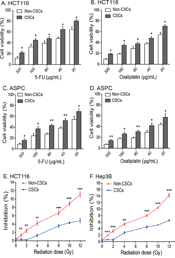 Figure 6: Chemotherapy and radiotherapy-resistance in CSCs. A-D. IGF2-upregulated CSCs isolated from HCT16 and ASPC cells are resistant to treatment with 5-FU and oxalipatin. * p<0.05, ** p<0.01 as compared to the non-CSCs. The results are expressed as the mean ± standard deviation of three independent experiments. E-F. The IGF2-upregulated CSCs from HCT116 and Hep3B cells are resistant to radiotherapy. Cells were irradiated with 1-12Gy radiation and evaluated by WST-1 cell proliferation assays. ** p<0.01, *** p<0.001 as compared to the non-CSCs.