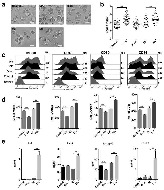 Figure 2: Dia induced dendritic cells (DCs) maturation. a. DCs were treated with DMSO (equal volume to Dia, as control), LPS (10 ng/ml), β-carotene (β-car) (1 μM), CE (equal volume to Dia) or Dia (1 μM) respectively for 24 hours and morphology of DCs dendrites were observed by microscopy. Scale bar = 30 μm. b. The statistical result of the cellular shape index. Horizontal lines across the scatter diagram represent mean values. n = 50 (50 dendritic cells randomly selected from 3 separate experiments). c. DCs with different treatments were stained for the indicated surface molecules and analyzed by FACS. d. The mean fluorescence intensity (MFI) values of indicated surface molecules are shown as the mean ± SD. e. Supernatants of DCs culture were collected and tested for IL-6, IL-10, IL-12p70, and TNFα by ELISA. Data are represented as mean ± S.D. One representative of three similar independent experiments is shown.