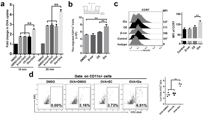 Figure 3: Dia efficiently enhanced DCs antigen capture in vitro and increased the number of antigen-loaded DCs in mesenteric lymph nodes (MLN). a. The antigen uptake of DCs incubated with 1 μg/ml FITC-OVA combined with DMSO (equal volume to Dia), β-carotene (1 μM), CE (equal volume to Dia) or Dia (1 μM) respectively were analyzed by flow cytometry. The average uptake of DCs incubated with FITC-OVA at 4°C was taken as 1 (shown as the “control” group). b. DCs were seeded into the upper wells of a 24-well transwell chamber, and CCL19 (200 ng/ml) was included in the lower wells. After 4 hours, the number of DCs that transferred from the upper to the lower wells was counted. c. The expressions of CCR7 were determined by FACS. d. Mice terminal ileal ligated loop was injected with DMSO or 100 μl FITC labeled OVA (10 μg/ml) containing Dia, DMSO or CE. 2 hours later, the OVA-loaded DCs in MLN were analyzed by FACS. Data are represented as mean ± S.D. One representative of three similar independent experiments is shown.