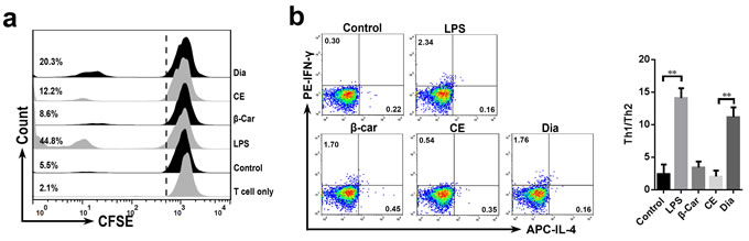Figure 4: Dia-treated DCs promoted T cell proliferation and Th1 polarization. a. DCs were incubated with β-carotene (1 μM), CE (equal volume to Dia), Dia (1 μM), or LPS (10 ng/ml) respectively for 24 hours. cells were washed extensively and then co-cultured with CFSE-labeled T cells at a ratio of 1:10. Control represents unstimulated DCs. Single T cell group is also shown. T cell proliferation was analyzed by CFSE dilution using FACS. Percentages refer to proportion of T cells that proliferated within 5 days. b. DC-driven Th1/Th2 differentiation was detected. DCs with different treatments were incubated with autologous naïve CD4+ T cells at a ratio of 1:4 for 15 days. LPS-stimulated DCs co-cultured with naïve T cells were as a positive control. The resulting T cells were analyzed for their capacity to secrete IFN-γ and IL-4. Data are represented as mean ± S.D. One representative of three similar independent experiments is shown.