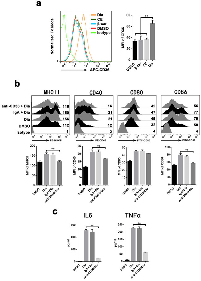 Figure 6: Antibody against CD36 inhibit the Dia-induced maturation of DCs. a. Dia treated DCs had an up-regulated expression of CD36. DCs were treated with DMSO (equal volume to Dia), EC (equal volume to Dia) or Dia (1 μM) for 24 hours, then stained for CD36 and analyzed by FACS. b. DCs were exposed to control IgA, anti-CD36 mAbs (IgA) at the concentration of 30 μg/ml for 1 hour, followed by adding Dia (1 μM). 24 hours later, DCs were stained for the indicated surface molecules and analyzed by FACS. c. DCs was treated as described in (b). The supernatants were collected and tested for IL-6 and TNFα by ELISA. Data are represented as mean ± S.D. One representative of three similar independent experiments is shown.