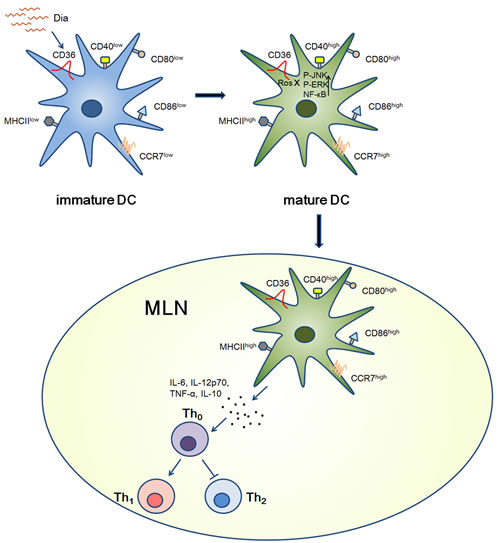 Figure 7: Graphical Abstract. Schematic view of Dia-induced DCs maturation. When encountered with immature DCs, Dia could induce DCs maturation by up-regulating the expression of MHCII and other co-stimulatory molecules via CD36 and NF-κB signals. As the same time, the expression of CCR7 was also up-regulated, resulting in a high migration ability towards MLN. After arriving at MLN, DCs promoted Th1 polarization.