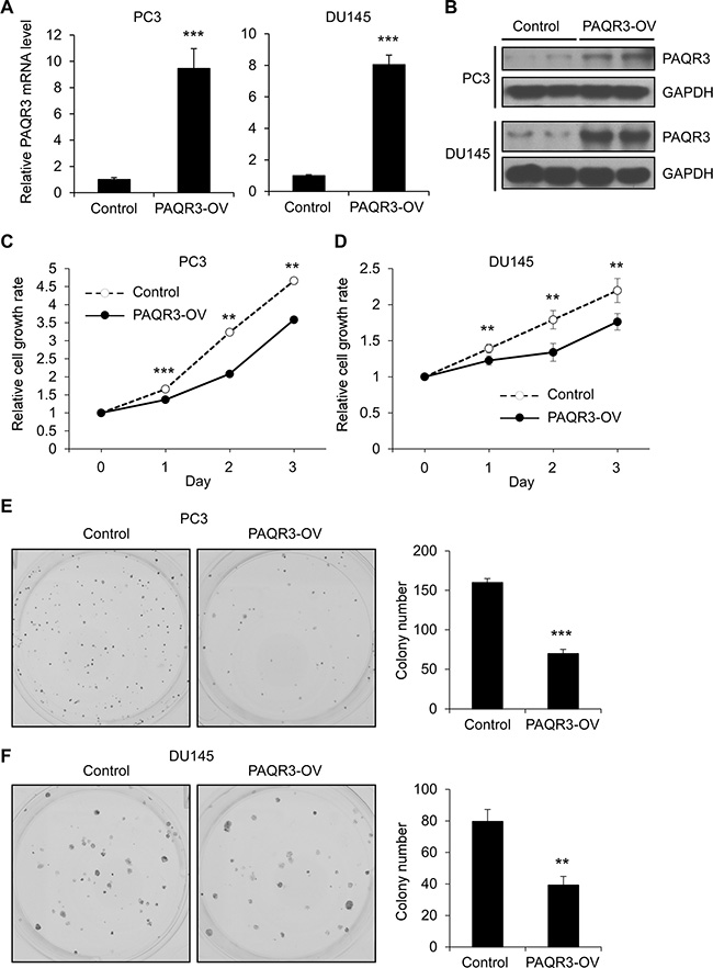 Figure 1: PAQR3 overexpression reduces cell proliferation and colony formation in human prostate cancer cells. (A, B) The expression level of PAQR3 in control and PAQR3-overexpressing (PAQR3-OV) prostate cancer cells as detected by quantitative RT-PCR and Western blotting. (C, D) Effect of PAQR3 overexpression on the cell proliferation rate. PC3 or DU145 cells expressing empty vector or PAQR3 were cultured for 3 days and the cell proliferation rate was determined by MTT assay at the indicated time point. (E, F) Effect of PAQR3 overexpression on colony formation. PC3 or DU145 cells with stable expression of vector or PAQR3 were seeded into 6-well with 500 cells per well and cultured for 7 days, followed by crystal violet staining and colony counting. All the data are shown as mean ± SD and * for P < 0.05, ** for P < 0.01, *** for P < 0.001.