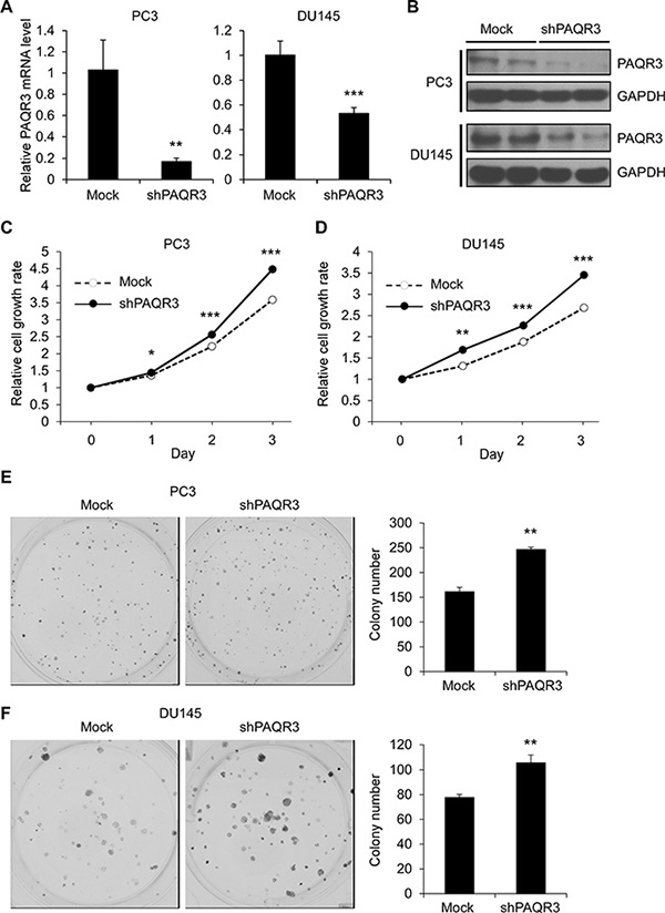Figure 2: Knockdown of PAQR3 in human prostate cancer cells enhances cell proliferation and colony formation. (A, B) The expression level of PAQR3 in PC3 and DU145 cells expressing control shRNA (mock) and PAQR3-specific shRNA (shPAQR3) were detected by quantitative RT-PCR and Western blotting. (C, D) Effect of PAQR3 knockdown on cell proliferation. The prostate cancer cells as in A and B were used to determine the cell proliferation rate by MTT assay at the indicated time point. (E, F) Effect of PAQR3 knockdown on colony formation. PC3 or DU145 cells as in A and B were seeded into 6-well with 500 cells per well and cultured for 7 days, and then used in crystal violet staining and colony counting. All data are shown as mean ± SD and * for P < 0.05, ** for P < 0.01, *** for P < 0.001.