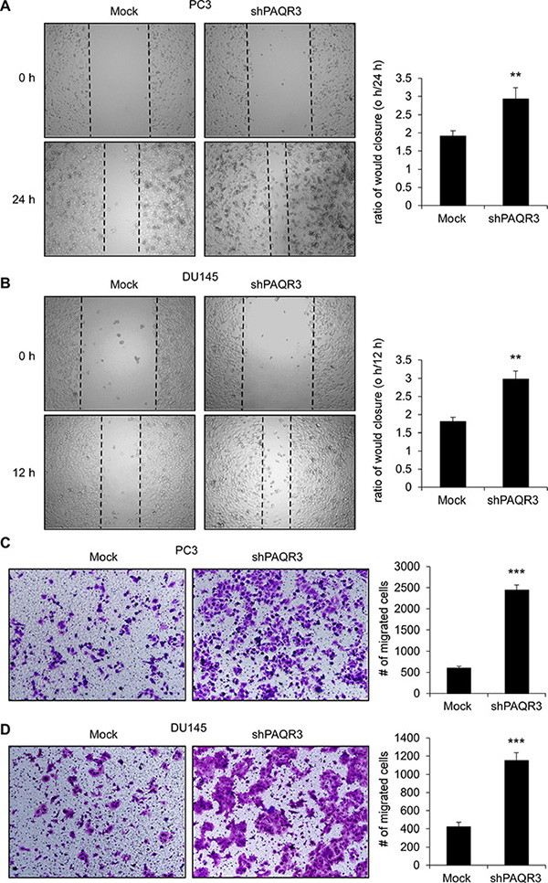 Figure 4: Knockdown of PAQR3 enhances migration in human prostate cancer cells. (A, B) Effect of PAQR3 knockdown on cell migration in wound healing assay. A scratched-wound healing assay was performed with the cells expressing control or PAQR3-shRNA, followed by photography at the time as indicated.(C, D) Effect of PAQR3 knockdown on migration in transwell assay. PC3 or DU145 cells with expression of control shRNA (mock) or PAQR3-shRNA were seeded into transwell chambers . Then cells on small chambers were fixed in 24 h (for DU145) or 48 h (for PC3) and stained with crystal violet, imaged and counted. All the data are shown as mean ± SD and *** for P < 0.001.
