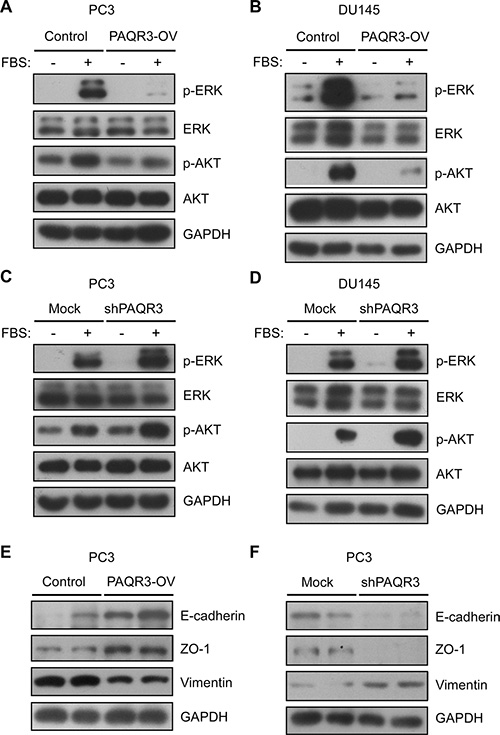 Figure 5: PAQR3 inhibits PI3K/AKT and MAPK/ERK signaling pathways and suppresses EMT features in human prostate cancer cells. (A, B) PAQR3 overexpression inhibits PI3K/AKT and MAPK/ERK signaling pathways. After serum starvation for overnight, PC3 and DU145 cells with overexpression of control vector or PAQR3 (PAQR3-OV) were stimulated with 10% FBS for 15 min and the cells were harvested for immunoblotting using the antibodies as indicated. (C, D) Knockdown of PAQR3 enhances PI3K/AKT and MAPK/ERK signaling pathways. PC3 and DU145 cells that expressed control shRNA or PAQR3-specific shRNA (shPAQR3) were serum-starved overnight, followed by stimulation with 10% FBS for 15 min and immunoblotting. (E, F) PAQR3 suppresses EMT features. PC3 cells with overexpression or knockdown of PAQR3 were used to analyze the expression of epithelial markers E-cadherin and ZO-1 and mesenchymal marker vimentin.