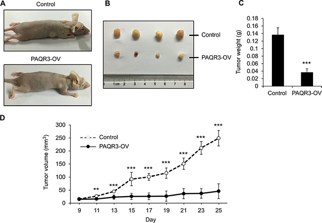 Figure 6: PAQR3 overexpression reduces the growth of PC3 cell xenografts in nude mice. (A) Representative images of subcutaneous tumor xenografts in nude mice inoculated with PC3 cells expressing control vector or PAQR3. (B) Representative images of the tumors isolated from the mice. (C) The weight of the tumors. (D) Tumor volume as calculated according to the formula 0.5 × length × width2. All the data are shown as mean ± SD and ** for P < 0.01 and *** for P < 0.001.