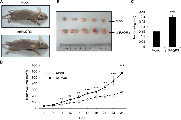 Figure 7: Knockdown of PAQR3 enhances the growth of PC3 cell xenografts in nude mice model. (A) Representative images of subcutaneous tumor xenografts in nude mice inoculated with PC3 cells expressing control shRNA or PAQR3-specific shRNA. (B) Representative images of the tumors isolated from the mice. (C) The weight of the tumors. (D) Tumor volume as calculated according to the formula 0.5 × length × width2. All the data are shown as mean ± SD and ** for P < 0.01 and *** for P < 0.001.