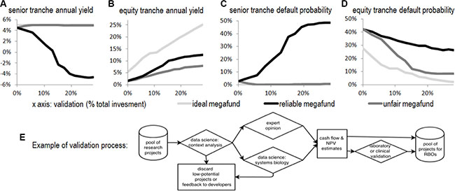 Average annual yield and probability of loss of senior and equity tranches, for a megafund of 150 drug development programs that aims to serve a respectable return to senior tranches, strongly depend on the type of megafund. These statistics suggest using validation mechanisms to get closer to an ideal megafund. The underlying mathematics and parameters are in the next section.