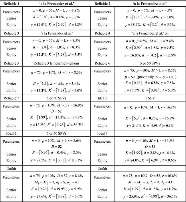 Our stylized “reliable” megafund does not perform extensive due diligence like the ideal megafund but will randomly choose “lemons” alongside other projects and distribute them evenly among SPVs. The case of a single SPV then corresponds to the case studied by Fernandez et al. [2] and indeed Table 1 shows that low risks and potentially sufficient returns can be obtained when pooling 150 assets. Making several SPVs to attract diverse investors generates non negligible risks in senior tranches, thus making one naturally wonder if returns can be high enough to attract investors.