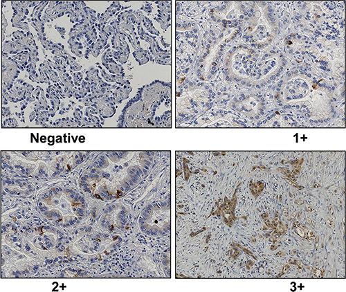 Immunohistochemically, GalNAc-T6 expression was rare or very weak in the normal bronchioloalveolar epithelium samples (data not shown), whereas cytoplasmically immunostained in lung adenocarcinoma cells (Figure 1). As shown in Table 2, the 198 patients were divided into two groups, namely the GalNAc-T6-negative group (143 patients) and the GalNAc-T6-positive group (55 patients: 45 1+, 8 2+ and 2 3+).