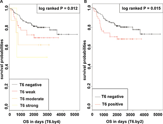 Expression level of GalNAc-T6 was analyzed as a dichotomous variable (negative VS positive). Gender, smoking, differentiation, T-stage, and N-stage were considered as categorical variables. Age and max-size of tumor were measured as continuous variables. In COX PH survival analysis, the log-transformed variable tumor size (logMax.size) was quartered and thus transformed to categorical variable. The associations of GalNAc-T6 with categorical variables were tested with Chi-square test or the Fisher exact test, as appropriate. Welch’s two-sample t-test was used to compute P values for continuous variables.