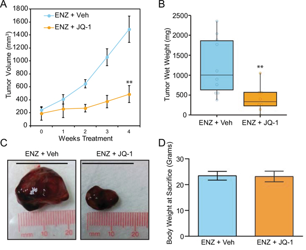 Figure 4: BET bromodomain inhibition suppresses growth of mutant F877L AR xenografts implanted in castrated mice. A. MR49F cells were implanted in the flanks of castrated, immunocompromised mice. Once tumors reached 100mm3, mice were randomly assigned to two groups: Monday-Friday (M-F) treatment with enzalutamide (10 mg/kg) by oral gavage plus vehicle by intraperitoneal injection (n=10 animals) or M-F treatment with enzalutamide (10 mg/kg) + JQ-1 50 mg/kg by intraperitoneal injection (n=eight animals) for four weeks. Tumor volume was measured weekly (length x width caliper readings). Data are mean tumor volumes; error bars represent SEM. 2-sided t-test with equal variance was performed at end point (week 4). **: p ≤ 0.01. B. Mice were sacrificed at the conclusion of the study, and tumor wet weights were recorded. 2-sided, 2-sample t-test with Welch's correction was performed. **: p ≤ 0.01. C. Representative images of xenografts from each treatment group following sacrifice and removal from mice. Scale bar= 20 mm. D. No significant difference in final body weight was observed between the two treatment groups (2-sided t-test with equal variance).