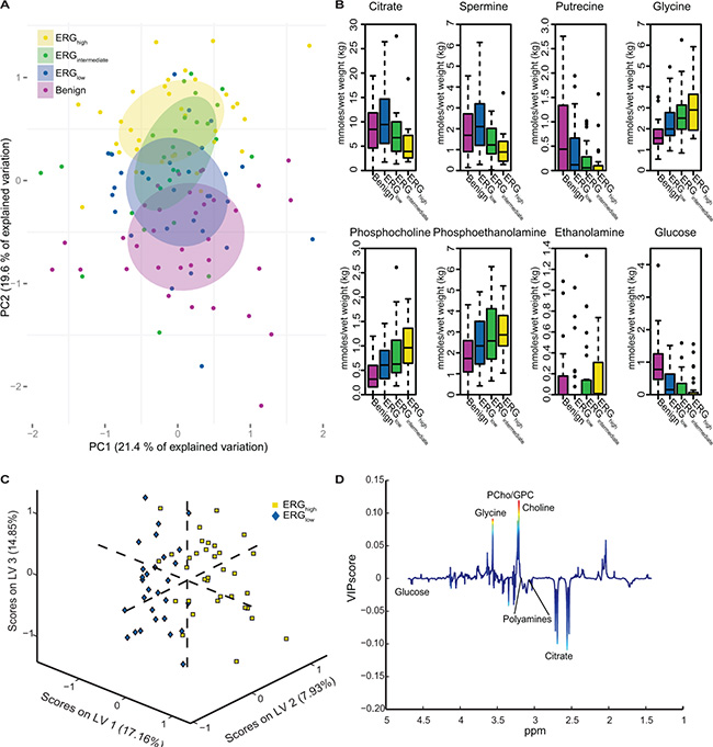 Figure 1: Multivariate analysis of spectral data and absolute quantification reveals metabolic differences between ERG groups. (A) Principal component analysis (PCA) reveals a trend in the distribution of the metabolic clusters of metabolic profile from benign samples (purple) across ERGlow (blue) and ERGintermediate (green) to ERGhigh (yellow). (B) Absolute quantification of 23 metabolites showed significant trend across cancer samples, from ERGlow, (blue) through ERGintermediate (green) to ERGhigh (yellow) for eight of the metabolites. Increasing trends were found for glycine, phosphocholine, phosphoethanolamine, and ethanolamine. Decreasing trends were found for citrate, spermine, putrescine and glucose. Benign (purple) samples are shown for comparisons. (C) A partial least squares discriminant analysis (PLS-DA) model was able to separate ERGhigh (yellow) and ERGlow (blue) with a accuracy of 77 %, p < 0.001. (D) Loadings plot of latent variable 1 (LV1) indicate lower levels of citrate and the polyamines and higher levels of choline-containing metabolites comparing ERGhigh to ERGlow. The loadings are colored according to the variable importance in the projection (VIP) scores.