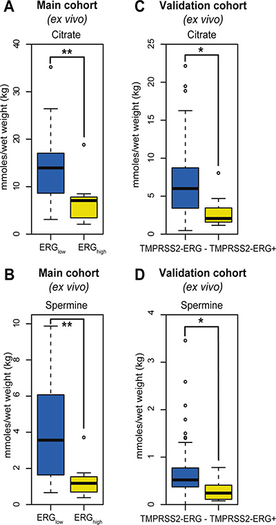 Figure 5: Box-plots for citrate and spermine comparing ERGhigh and ERGlow samples in the main cohort (in vivo). (A) No significant difference in levels of citrate/creatine in the main cohort (in vivo MRSI) between ERGhigh and ERGlow, p = 0.083, (B) Decreased levels of citrate/creatine were found comparing ERGhigh to ERGlow in the main cohort (in vivo MRSI), restricting to low Gleason samples, p < 0.001, (C) No significant difference in levels of spermine/creatine between ERGhigh and ERGlow in the main cohort (in vivo MRSI), p= 0.158, (D) No significant difference in levels of spermine/creatine were found comparing ERGhigh and ERGlow in the main cohort (in vivo MRSI), restricting to low Gleason samples, p = 0.094.