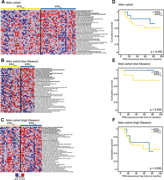 Figure 4: Single sample GSEA (ssGSEA) show alterations of several key metabolic pathways and biochemical recurrence for ERGhigh and ERGlow and Kaplan-Maier plots for biochemical recurrence. ssGSEA results of key metabolic pathways for the main cohort (A) the low Gleason samples (B) and the low Gleason samples within the main cohort (C) where red indicates up-regulation of the given gene set and blue down-regulation of a given gene set. Pathways with significantly different (p < 0.05) ssGSEA-values comparing ERGhigh and ERGlow while adjusting for multiple samples per patient, are indicated in bold. Kaplan-Maier plots for ERGhigh and ERGlow in the main cohort (D), low Gleason patients (E) and high Gleason patients (F).