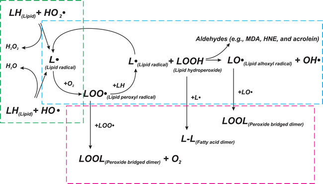 Figure 2: Scheme of lipid peroxidation chain reaction. Lipid peroxidation chain reactions initiated by free radicals consists of three major steps (initiation, propagation, and termination), which are marked by green, blue, and red frames, respectively. LH - Lipid molecule, L• - Lipid radical, LOOH - Lipid hydroperoxide, LOO• - Lipid peroxyl radical, LO• - Lipid alhoxyl radical, LOOL - Peroxide bridged dimer, L-L - Fatty acid dimer, OH• - hydroxyl radical, HO2• - perhydroxyl radical. See text for details.