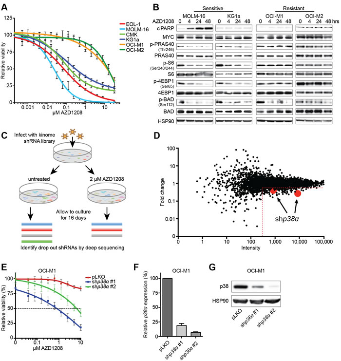 Figure 1: An shRNA screen identifies p38α loss to be synthetic lethal with PIM inhibitor treatment. A. Short-term viability assay of a panel of AML cell lines. Cells were treated for 5 days with increasing concentrations of AZD1208 and viability was measured using CellTiter-Blue (n = 3). B. AZD1208-resistant AML cell lines demonstrate sustained mTOR signaling upon treatment. Cells were treated for 4, 24, and 48 hours with 1 μM AZD1208 followed by western blot analysis (n = 3). C. Schematic outline of the synthetic lethality screen. OCI-M1 cells were infected with a lentiviral kinome shRNA library and cultured in the presence or absence of 2 μM AZD1208 for 16 days in replicates. shRNA barcodes were subsequently recovered by PCR and analyzed by next generation sequencing. D. The shRNA screen identifies p38α loss to be synthetic lethal with AZD1208. The x-axis depicts the average number of sequencing reads in the untreated sample (intensity). The y-axis depicts the fold change in abundance of shRNAs in the treated versus untreated population. Two shRNAs ( > 300 reads) targeting p38α were depleted in the treated population with a fold change of > 2. E. p38α knock down enhances AZD1208 response. OCI-M1 cells were infected with two shRNAs targeting p38α - pLKO serves as the control - and treated for 5 days with AZD1208. Cell viability was measured using CellTiter-Blue (n = 3). F.-G. Knock down of p38α was assessed on RNA and protein level.