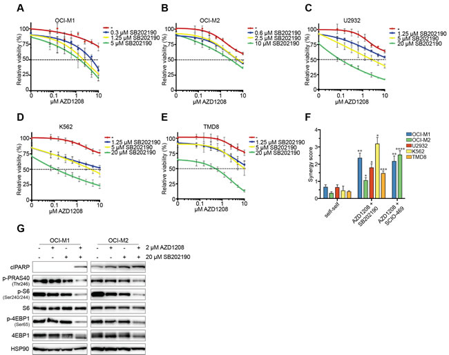 To assess whether AZD1208 synergizes with p38 inhibitors, we treated resistant AML (OCI-M1, OCI-M2), DLBCL (U2932, TMD8), and chronic myeloid leukemia (CML) (K562) cell lines with the combination of AZD1208 and the p38 inhibitors SB202190 or SCIO-469 (the latter is in phase II clinical trial for multiple myeloma: NCT00095680) (Figure 2A-2E and Figure S2A-S2C). Single drug treatment modestly inhibited viability, whereas dual inhibition synergistically suppressed growth. To determine the level of synergy, we used a previously described method that calculates additive effects (based on the Loewe smodel) and subtracts these values from the experimental values resulting in a synergy score (Figure S2D) [32]. We furthermore calculated combination indices - which is a widely accepted method to calculate synergy. A high synergy score and vice versa a low combination index indicate strong synergy. To determine the significance of our findings, we also treated cells with self-self inhibitor combinations, which theoretically should result in a synergy score of 0 and a combination index of 1. As expected, combined treatment of AZD1208 and either SB202190 or SCIO-469 resulted in high synergy scores and low combination indices (Figure 2F and Figure S2E).