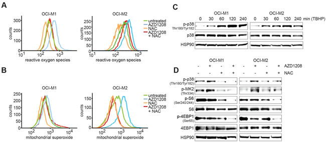 We subsequently investigated the mechanism by which PIM inhibition results in p38 activation. A recent study by Song et al. demonstrated that PIM knockout results in elevated reactive oxygen species (ROS) levels in mouse embryonic fibroblasts (MEFs) [36]. Since ROS is a known activator of p38 signaling [37], we measured total ROS and mitochondrial superoxide levels upon AZD1208 treatment in OCI-M1 and OCI-M2 cell lines (Figure 4A-4B). Interestingly, both ROS and superoxide levels were increased upon PIM inhibition, which could be reverted by treating cells with the ROS scavenger N-acetyl-cysteine (NAC). To validate that increased ROS levels can activate p38 in our cell lines, we treated OCI-M1 and OCI-M2 cell lines with ROS-inducing tert-butyl hydrogen peroxide (TBHP). As expected, induction of ROS levels results in rapid activation of p38 (Figure 4C). Furthermore, NAC prevented the activation of p38 signaling upon AZD1208 treatment and blocked activation of S6/4EBP1 (Figure 4D). These results suggest that PIM-inhibitor mediated upregulation of ROS might induce therapy resistance by activation of p38/AKT signaling.