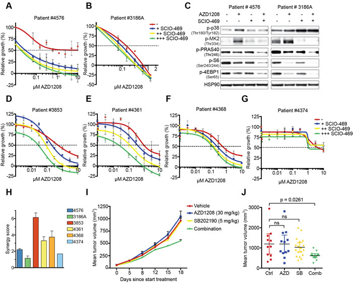Figure 5: Suppression of p38 signaling restores sensitivity to PIM inhibition in primary AML cells and mouse xenografts. A.-B. Inhibition of p38 enhances AZD1208 response in primary AML cells. Patient cells were treated with increasing concentrations of AZD1208 (x-axis) and co-treated with 0.313 μM, 1.25 μM, or 5 μM SCIO-469. Growth was measured after 4 days using MTT. A day 0 measurement was used as a baseline value (y-axis = ‘0’) for growth. Negative relative growth indicates a cytotoxic effect (n = 2). C. Combined p38/PIM inhibition suppresses mTOR signaling. Primary AML cells were treated for 24 hours with 1 μM AZD1208, 10 μM SCIO-469, or the combination. Cell lysates were harvested and subjected to western blot analysis. D.-G. Inhibition of p38 enhances AZD1208 response in a validation set of primary AML cells. Cells were treated with increasing concentrations of AZD1208 (x-axis) and co-treated with 0.3 μM, 1 μM, or 3 μM SCIO-469. Viability was measured after 72 hours using CellTiter-Glo. A day 0 measurement was used as a baseline value (y-axis = ‘0’) for growth. Negative relative growth indicates a cytotoxic effect (n = 2). H. SCIO-469 is synergistic with AZD1208. Primary AML cells were treated with 2-fold dilutions of AZD1208, SCIO-469, or the combination. Viability was assessed by CellTiter-Blue and used to calculate synergy scores. I. Dual PIM/p38 inhibition suppresses tumor growth in a xenograft model. K562 cells (5.106) were subcutaneously implanted in Rag2−/−IL2γc−/− mice. Once tumors were established, animals were treated with vehicle, AZD1208 (30 mg/kg), SB202190 (5 mg/kg), or both drugs in combination. J. Mean tumor volume after 18 days treatment. Vehicle (n = 11), AZD1208 (n = 12), SB202190 (n = 18), and combination (n = 14). P-values were calculated via one-way ANOVA and Dunnett’s test.
