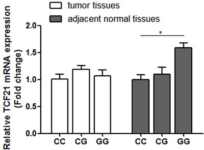 To assess the effects of rs12190287 genotypes on TCF21 mRNA expression levels, TCF21 mRNA expression levels were detected in 39 tumor tissues and adjacent normal tissues with different genotypes. As shown in Figure 1, TCF21 mRNA levels were significantly higher in normal breast tissues with rs12190287 GG genotypes than in those with rs12190287 CC genotype (P < 0.05).
