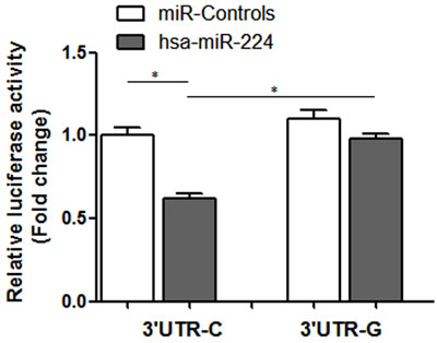 As shown in Figure 2, compared with the pmirGLO-TCF21 3’ UTR-G, the relative luciferase activity of pmirGLO-TCF21 3’ UTR-C was significantly reduced in the presence of hsa-miR-224, suggesting that rs12190287 polymorphism can regulate TCF21 mRNA expression by disturbing hsa-miR-224 binding.