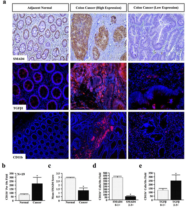 Figure 1: Loss of SMAD4 and TGFβ Overexpression Correlate with Increased Myeloid Infiltration in Colon Cancer Patients. a. Normal and cancer tissue from human colon cancer patients were stained for SMAD4, TGFβ1 and myeloid marker CD11b. SMAD4 and TGFβ1 staining intensity were blindly scored by two investigators from 0-3+ (representative images shown for low (0), intermediate (1+), and high (3+)), and CD11b+ cells quantified per 10x field. b. Quantification of CD11b+ revealed an increase in myeloid cell involvement in cancer when compared to adjacent normal tissue, consistent with increased inflammation. c. The mean SMAD4 score was reduced in colon cancer tissue (1.33) compared to normal sections (2.89). d. SMAD4 low patients (scores of either 0 or 1+) had significantly higher CD11b+ populations than SMAD4 intact (2 or 3+) populations. e. Patients with elevated TGFβ1 expression in the colon microenvironment displayed increased CD11b+ cell involvement. (*, P < 0.05).