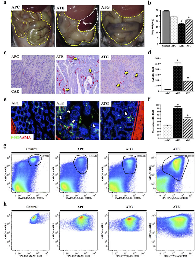 While ATG mice displayed a slight increase in splenic CD11b+GR1Hi inflammatory granulocytes compared to control and APC mice, ATE mice showed a near 8-fold and 4-fold increase compared to APC and ATG mice, respectively (Figure 3g). Additionally, gating to CD11b+GR1Hi cells revealed these cells were highly positive for F4/80, which increased incrementally in APC, ATG, and ATE mice, respectively (Figure 3h) and is likely indicative of the increased expansion/recruitment of splenic macrophages in ATG and ATE groups (N = 3 per group).