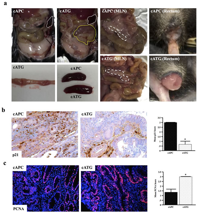 At four months, cAPC mice present with mild distention of the gastrointestinal tract, though are otherwise normal. cAPC mice were next crossed to mice with global TGFβ signaling deficiency (Tgfbr1+/- or TG) to form cATG mice. At four months, cATG mice presented with large tubular adenomas visible from outside the colon. These mice also developed gross splenomegaly, mesenteric lymphadenopathy, and rectal bleeding/prolapse (Figure 5a). Similar to the other TGFBR-deficient models, cATG mice also presented with reduced p21 expression and increased proliferation, indicative of a loss of TGFβ-induced cell cycle arrest (Figure 5b, 5c).