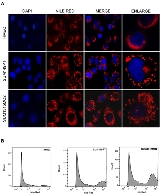 Electron microscopy (EM) imaging was performed to visualize lipid bodies in HMEC, SUM149PT and SUM1315MO2 cells (Figure 1A). The control HMEC cells had very few small lipid bodies (Figure 1A) while, SUM149PT and SUM1315MO2 cells had a larger number of bigger and denser lipid bodies (Figure 1A). Quantitatively, 76.9% of SUM149PT and 46.2% of SUM1315MO2 cells imaged had lipid bodies in comparison to 34.8% of HMEC cells (Figure 1B). Staining with Nile red further confirmed the abundance of lipid bodies in SUM149PT and SUM1315MO2 breast cancer cells (Figure 2A). Flow cytometry revealed an overabundance of lipid bodies in SUM149PT and SUM1315MO2 cells when compared to HMEC (Figure 2B).