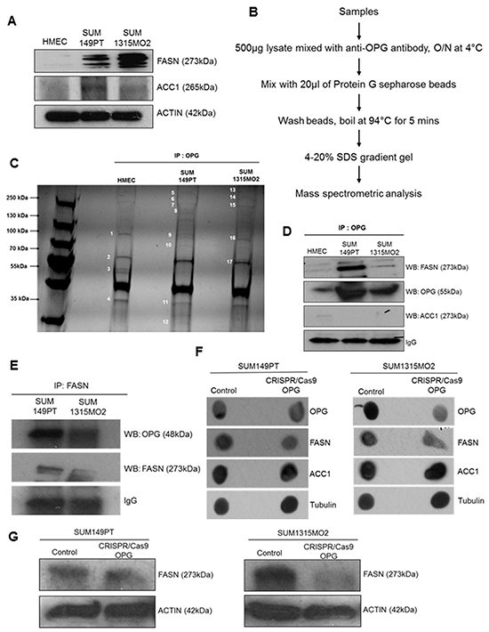 Figure 3: Mass spectrometric analysis of immunoprecipitates of anti-OPG with lysates from HMEC, SUM149PT, and SUM1315MO2 cells. A. RIPA lysates from HMEC, SUM149PT and SUM1315MO2 cells were western blotted for FASN and ACC. Actin was used as a loading control. A representative blot from three independent experiments is shown. B. Schematic for mass spectrometric analysis C. Lysates from HMEC, SUM149PT and SUM1315MO2 cells were immunoprecipitated with anti-OPG antibody. Immunoprecipitated proteins were separated by SDS-PAGE and gel bands, as indicated by the numbers, were analyzed by mass spectrometry. D. Immunoprecipitates were subjected to Western blot analysis for FASN and OPG. Blot was then stripped and probed for ACC1 as a negative control. β-actin was used as loading control. A representative blot from three independent experiments is shown. E. Reverse immunoprecipitates with FASN antibody were subjected to Western blot analysis for OPG. Blot was then stripped and probed for FASN as a control. A representative blot from three independent experiments is shown. F. RIPA lysates from SUM149PT and SUM1315MO2 control and CRIPS/Cas9 OPG knockdown cells were dot blotted for OPG and FASN. ACC1 was used as a negative control. Tubulin was used as a loading control. A representative blot from three independent experiments is shown. G. RIPA lysates from SUM149PT and SUM1315MO2 control and CRIPS/Cas9 OPG knockdown cells were subjected to Western blot analysis for FASN. Actin was used as a loading control. A representative blot from three independent experiments is shown.