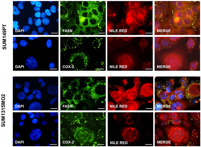 HMEC, SUM149PT, and SUM1315MO2 cells seeded in eight-well chamber slides (Nalge Nunc International) were fixed with 4% PFA, and stained with lipophilic stain Nile red (Nile blue oxazone) and counterstained with DAPI. Nile red is an excellent vital stain for the detection of intracellular lipid bodies. Stained cells were washed and viewed with the appropriate filters on an Olympus confocal laser-scanning microscope at 450/500nm excitation and 528nm emission (Fluoview FV10i) with the Metamorph digital imaging system [72].