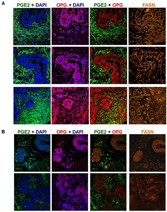 Sections of breast tissue from healthy subjects and cancer patients were obtained from Biochain Institute, Inc. (breast tumor tissue array Z7020007). The 16 patient breast cancer tissues array was used in an attempt to highlight a specific type of breast cancer i,e the invasive ductal carcinoma. The sample distribution was hugely varied with the tumor staging from T1N0M0 to T4N1M0 (T indicates the primary tumor, N indicates the regional lymph node metastasis and M indicates distant metastasis), the tumor grade varying from grade I-III and the age of the patients ranging from 28 – 77. IHC was performed using primary antibodies against human OPG, FASN and PGE2 using the protocols as described previously [72].