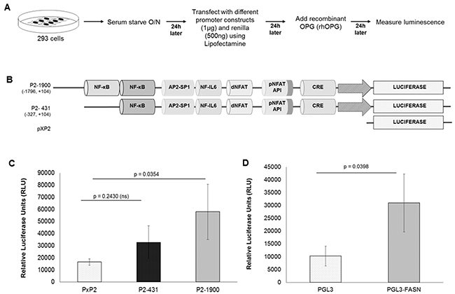Effect of OPG on COX-2 full length promoter (P2-1900), deletion, or mutant constructs [28, 29] was measured using a Dual-Luciferase kit according to the manufacturer’s protocol (Promega, Madison, WI). 293 cells were transfected using lipofectamine. The relative COX-2 promoter activity or number of relative luciferase units (RLU) was normalized to Renilla protein levels. Similarly, we performed the analysis for the effect of OPG on the transcriptional regulation of FASN promoter (pGL3-FASN). A plasmid encoding firefly luciferase under the control of the wild-type (WT) FASN promoter was obtained from Qiang Liu (Western College of Veterinary Medicine, University of Saskatchewan, Saskatoon, SK, Canada) and has been described previously [62].