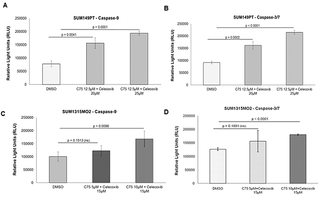 Caspase-9 and caspase-3/7 activity was measured using the caspase Glo assay (Promega G8211 and G8091) according to the manufacturer’s instructions. In brief, SUM149PT and SUM1315MO2 cells were incubated with serum free F-12 media containing different concentrations of various inhibitors for 24h. After 24h, 100μl of the conditioned media was added to the proluminescent LEHD (caspase-9) or DEVD (caspase-3) substrate at a 1:1 ratio in a 200μl volume and incubated at room temperature for 1 h in the dark. Following incubation, luminescence was measured using a luminometer. All samples were assayed in triplicate. Luminescence was expressed as RLU and is proportional to the amount of caspase activity present in the sample.