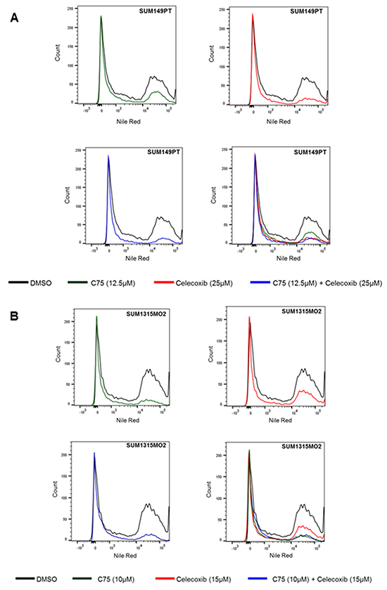 To determine the intracellular lipid content of control HMEC and breast cancer cells SUM149PT and SUM 315MO2 (treated and untreated), samples were incubated with Nile red (1 μg/ml) in the dark for 5 min at room temperature. The fluorescence intensity of each sample was measured immediately by flow cytometry at an excitation wavelength of 488 nm and emission wavelength of 550 nm. The data were collected using an LSRII flow cytometer and analyzed with FlowJo software at the RFUMS flow cytometry core facility.