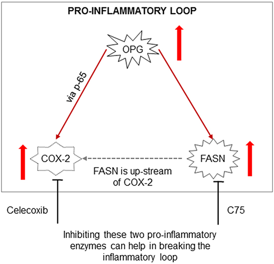 In this study, we investigated the anti-tumorigenic, anti-lipogenic, and anti-inflammatory potential of COX-2 inhibitor celecoxib and FASN blocker C75 on two specific breast cancer cell lines. Our results suggest that celecoxib and C75 could act in a concerted way with improved therapeutic potential in invasive breast cancer.