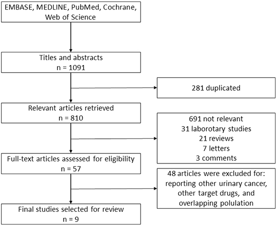 The work flow chart for this study is shown in Figure 1. The systematic search identified 1091 relevant references. Overall, 281 duplicated articles were removed. After screening titles and abstracts, we excluded 753 articles, including laboratory studies, meeting abstracts, reviews, letters and other articles irrelevant to our study. After assessing the full text, 48 additional articles were excluded. Ultimately, nine [11-19] retrospective cohort studies were included in the following meta-analysis.