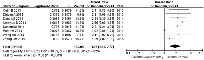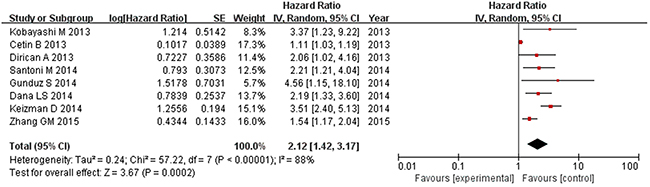 Prognostic outcomes, including OS and PFS, were quantitatively synthesized. The results of the meta-analysis are displayed in Figures 2 and 3. Heterogeneity is illustrated in each forest plot. In Figure 2, OS values were available from eight [11-13, 15-19] studies on renal cell carcinoma. The synthesized hazard risk favored the low NLR patients (pooled HR: 1.93, 95% CI: 1.35-2.77; P = 0.0003; I2 = 82%), which meant that patients with a higher NLR had a greater mortality risk than those with a low NLR. Figure 3 shows that eight [11-15, 17-19] studies provided sufficient data on PFS outcome. The pooled results showed significant superiority of a low NLR in renal cancer (pooled HR: 2.12, 95% CI: 1.42–3.17; P = 0.0002; I2 = 88%). Because high I2 values were found in the pooled analysis, sensitivity analysis of the estimated outcomes was also performed. This analysis shows that no pooled outcomes (neither OS nor PFS) were altered by removing any included study, and the I2 value stayed above 80% except after removing the study of Park et al. [16] from the OS estimate (I2 decreased to 41%), or removing the study from Cetin et al. [11] from the PFS estimate (I2 decreased to 56%).
