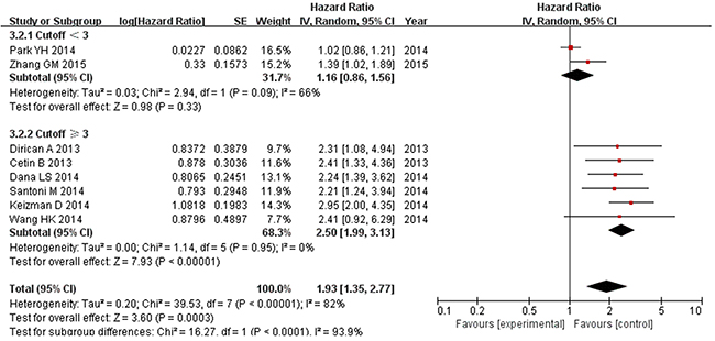 Figure 4: Subgroup analysis of pooled overall survival based on a NLR cutoff value.