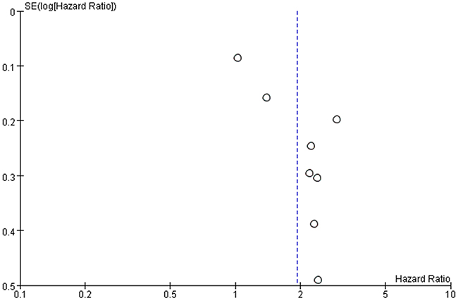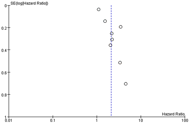 Funnel plots of the studies used in the meta-analysis to evaluate OS and PFS are shown in Figures 6 and 7. The asymmetrically distributed plots indicated there was potential publication bias. However, because the number of included studies was just eight, the funnel plots may not be significant.