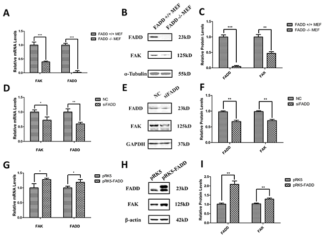 Figure 2: FADD regulated FAK expression in MEF cells. A. mRNA level of FAK down-regulated in FADD−/− MEF cells. B. and C. Representative western blot analysis (B) and quantification of expression (C) of FADD and FAK in FADD+/+ and −/− MEF cells. α-Tubulin was used as a loading control and the FADD+/+ MEF cell served as the sample control. D. FADD was interfered by 20 µM siRNA (siFADD) in MEF cells for 48 h, scramble siRNAs served as negative control (NC). The mRNA expression of FAK decreased in siFADD samples compared with NC. E. and F. Representative western blot analysis (E) and quantification of expression (F) of FADD and FAK in FADD knockdown MEF cells by siRNA. GAPDH used as a loading control. MEFs treated with scramble siRNAs served as the sample control. G. The cloned pRK5-FADD plasmid was transfected into MEFs to make FADD overexpressed and pRK5 empty vector plasmid as negative control. The mRNA level of FAK increased in cells with pRK5-FADD plasmid compared to the cells with empty plasmid. H. and I. Representative western blot analysis and quantification of expression of FADD and FAK in FADD overexpression MEF cells. GAPDH used as a loading control. MEFs transfected with pRK5 empty vector plasmid acted as the sample control. mRNA levels were monitored by qRT-PCR and proteins were detected with indicated antibodies by western blotting. Band intensity was quantified by Image J software. The results shown are representative of three different experiments. Data are represented as mean ± S.D. *p < 0.05; **p < 0.01, ***p < 0.001.