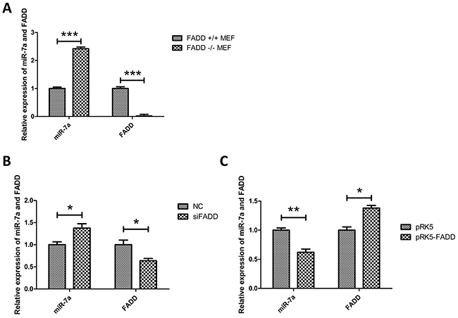 Figure 3: Expression of miR-7a was up-regulated in FADD-/- MEFs. A. Validation of expression of the only up-regulated miRNA, miR-7a, screened by microarray analysis in FADD−/− MEFs compared with FADD+/+ MEFs (Table 1) detected by qRT-PCR. B. and C. When FADD was knockdown by RNAi (B) or overexpressed by transfected pRK5-FADD plasmid (C), the expression of miR-7a reversely correlated to FADD expression in MEFs. The results shown are representative of three different experiments. Data are represented as mean ± S.D. *p < 0.05; **p < 0.01, ***p < 0.001.