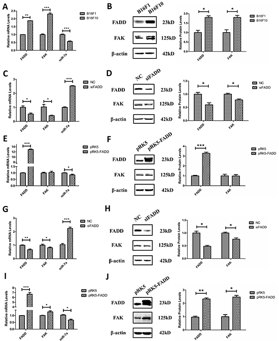 Figure 4: FADD regulated FAK and miR-7a expression in B16F10 and B16F1 melanoma cells. A. and B. In highly metastatic B16F10 cells, FADD and FAK exhibited higher level of mRNA (A) and protein (B) expression compared to lowly metastatic B16F1 cells. Conversely, the expression of miR-7a is lower in B16F10 cells than in B16F1. B16F1 cells served as the control sample. C. FADD was interfered by 20 mM siRNA (siFADD) in B16F10 cells for 48 h, scramble siRNAs as negative control (NC). The mRNA expression of FAK decreased in cells with siFADD compared to NC group while the expression of miR-7a increased. D. Representative western blot analysis and quantification of expression of FADD and FAK in FADD knockdown B16F10 cells by siRNA. β-actin used as a loading control. E. FADD was overexpressed by transfected pRK5- FADD plasmid into B16F10 cells for 48 h. The mRNA expression of FAK increased in cells with pRK5-FADD plasmid compared to those with pRK5 empty vector plasmid while miR-7a decreased. F. Representative western blot analysis and quantification of expression of FADD and FAK in FADD overexpressed B16F10 cells. β-actin acted as a loading control. G. and I. The mRNA level of FAK expression also increased while FADD up-regulated (I) and decreased while FADD down-regulated (G) in B16F1 cells. H. and J. Representative western blot analysis and quantification of expression of FADD and FAK in FADD knockdown (H) or overexpressed (J) B16F1 cells. β-actin served as a loading control. Cells treated with siRNA scramble negative control (NC) and pRK5 empty vector plasmid served as the sample control. mRNA levels were detected by qRT-PCR and proteins were detected with indicated antibodies by western blotting. Band intensity was quantified by Image J software. The results shown are representative of three different experiments. Data are represented as mean ± S.D. *p < 0.05; **p < 0.01, ***p < 0.001.
