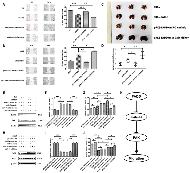 Figure 7: MiR-7a was a mediator in FADD-regulated expression of FAK. A. Firstly, transfected FADD siRNA (siFADD) alone or co-transfected with FADD siRNA (siFADD) and miR-7a mimic or inhibitor into B16F10 cells for 48 hours. Then a 24 h period scratch wound healing assay had been launched in those transfected B16F10 cells after the transfection. Inhibiting miR-7a expression rescued FADD interference reduced cell migration. Migration was retarded even more when miR-7a mimic were used instead of inhibitor co-transfected with FADD siRNAs. B. Firstly transfected pRK5-FADD plasmid alone or co-transfected pRK5-FADD plasmid together with miR-7a mimic or inhibitor into B16F1 cells for 48 hours. Then a 24 h period scratch wound healing assay had been launched in those B16F1 cells after the transfection. FADD overexpression promoted cell migration which is repressible by miR-7a mimic. Cells co-transfected with pRK5-FADD and miR-7a inhibitor exhibited the fastest migration rate among the four different samples. C. and D. B16F1 melanoma cells treated with pRK5 empty vector plasmids, pRK5-FADD plasmids, pRK5-FADD plasmids plus miR-7a mimic and pRK5-FADD plasmids plus miR-7a inhibitor, were collected and suspended in PBS. Then the treated cells were injected into the tail vein of C57BL/6 mice. After 14 days, mice were sacrificed with all the lung tissues were excised and the surface lung tumor nodules were counted. The representative pictures of lung metastases (C) and the number of metastasis foci on the surface of lung (D). Data are presented as mean ± S.D. n=5. E, F. and G. Representative western blot analysis (E) and quantification of expression of FADD (F) and FAK (G) in the miR-7a inhibitor/mimic co-transfected with FADD siRNAs experiment in B16F10s assessed by western blot. H, I. and J. Representative western blot analysis (H) and quantification of expression of FADD (I) and FAK (J) in the miR-7a inhibitor or mimic co-transfected with pRK5-FADD experiment in B16F1s assessed by western blot. β-actin served as a loading control. Cells treated with siFADD scramble siRNA negative control (NC) and miR-7a mimic or inhibitor nc served as the sample control in the former experiment, while those treated with pRK5 empty vector plasmid and miR-7a mimic or inhibitor nc served as the sample control in the latter one. K. The systematic schema of the relations between FADD, FAK and miR-7a. Band intensity was quantified by Image J software. The results shown are representative of three different experiments. Data are represented as mean ± S.D. *p < 0.05; **p < 0.01, ***p < 0.001.