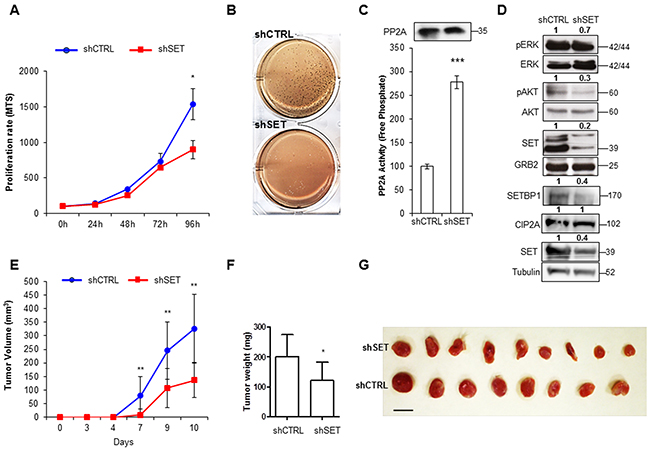 Figure 1: Depletion of SET results in the reduction of cell proliferation and clonogenic growth in AML. A. Cell proliferation curve assessed by MTS assay in HL-60 cells with silenced SET shRNA (shSET) compared to control shRNA (shCTRL). B. Soft-agar clonogenic growth assay (colony forming capacity in soft-agar media), in HL-60 cells with shSET compared to control shRNA. C. PP2A activity assay with paired Western blot detection of the amount of PP2A immunoprecipitated. Data are the means ± SD of three independent experiments. D. Representative Western blot of the phosphorylation state of PP2A targets ERK (T202/Y204) and AKT (T308), CIP2A and SETBP1, together with the endogenous levels of SET, in cells stably transfected with shRNA of SET versus control. GRB2 and Tubulin were used as loading control. Numbers indicate the protein quantification relative to GRB2 or Tubulin and assessed using Image J software (NIH, USA). Tumor volumes E. and tumor weights F. in Rag2-/- γc-/- mice xenografts of HL-60 cells stably transfected with SET or control shRNAs, and the corresponding picture of the extracted tumors G.. Statistically significant differences are indicated: *P < 0.05, **P < 0.01, ***P < 0.001, Student’s t-test analysis.